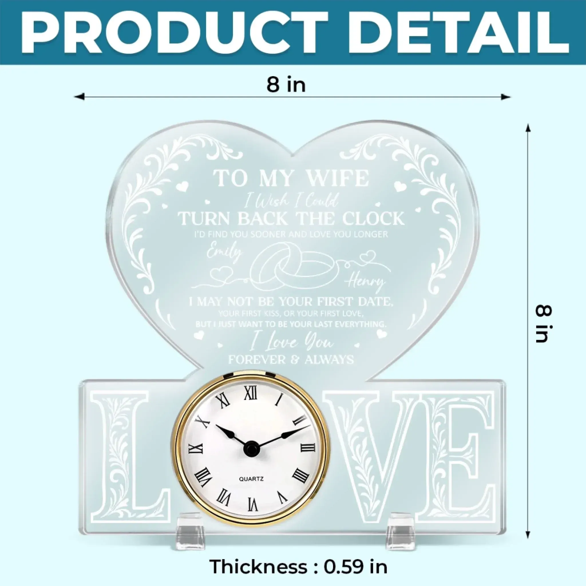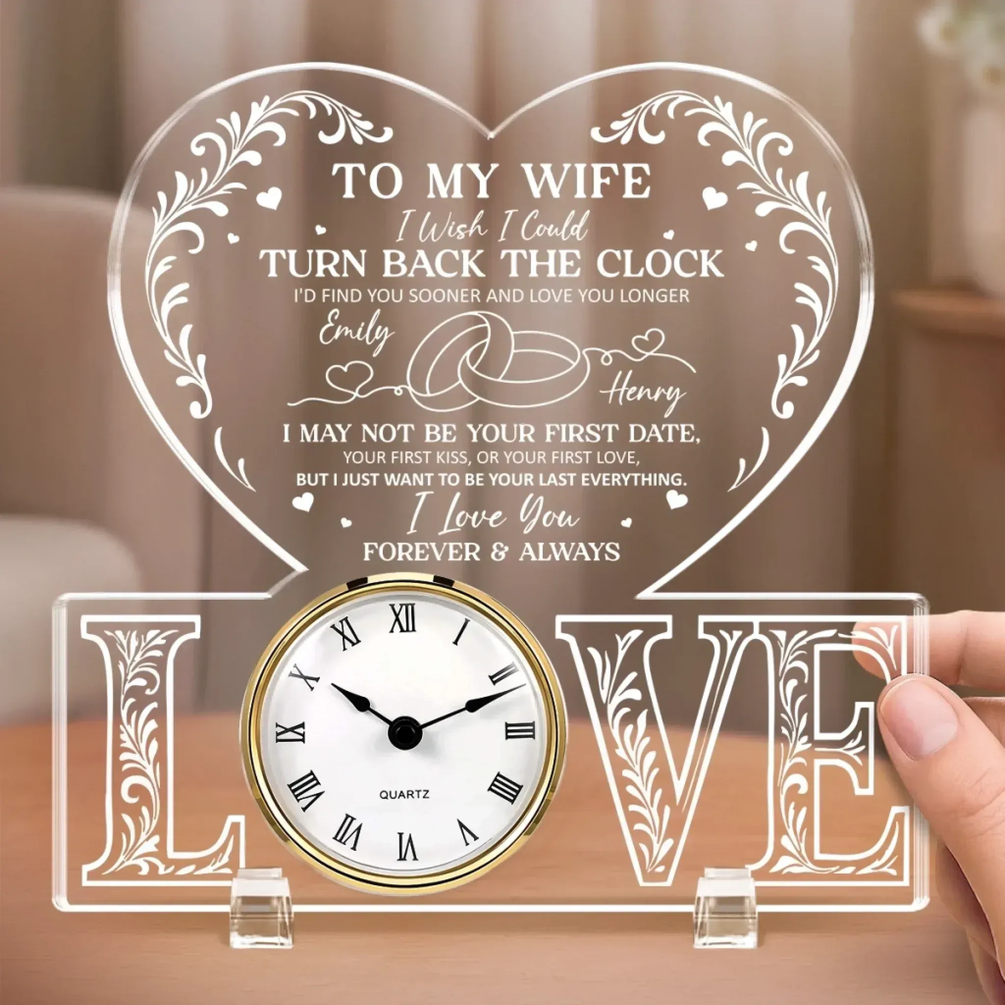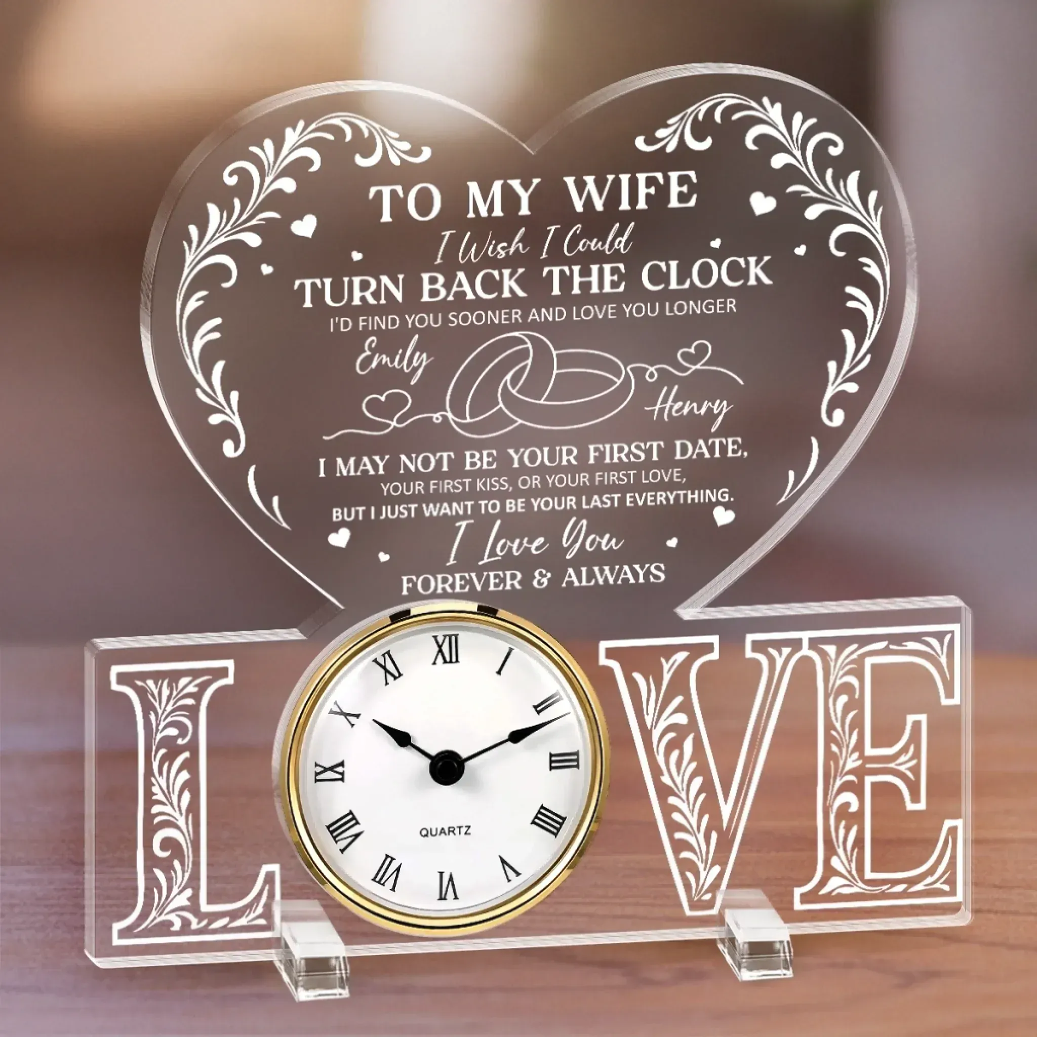 This acrylic desk clock is more than just a timepiece. It’s a heartfelt keepsake that captures your love and appreciation timelessly. Designed for display on desks, shelves, or nightstands, it seamlessly blends function and sentiment. This is the perfect gift for anyone, suitable for all occasions: birthdays, holidays, anniversaries, graduations, Valentine's Day, Mother's Day, Father's Day, and just because! Whether for friends, family, or that special someone, this versatile gift is guaranteed to bring joy and make lasting memories.